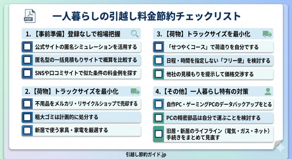 まずは、電話番号入力が任意の一括見積もりサイトで、3社の概算を比較してください。個人情報を守りつつ、他社の価格という「武器」を手に入れてから、本見積もりへ。これが一人暮らしの引越しを、最も賢く進める方法です。
